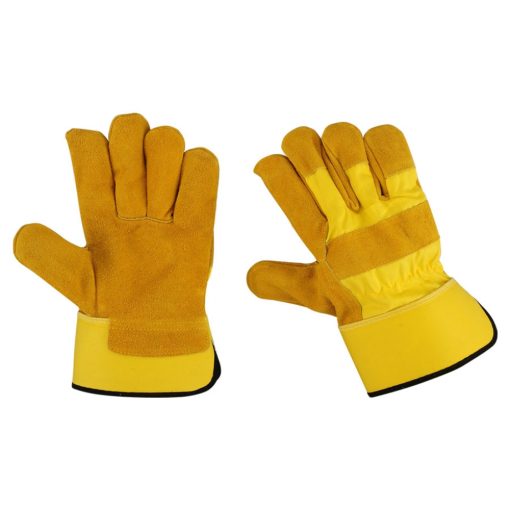 Palm yellow split gloves three finger tips yellow cloth back and shirred elastic on back wing thumb index finger rubberized cuff black piping.